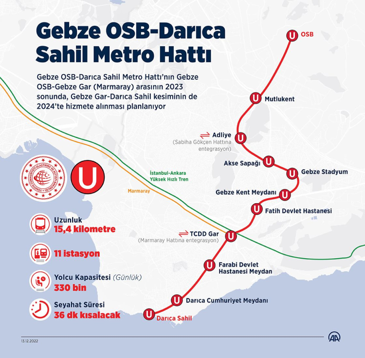 Darıca Sahil İstasyon, Darıca Cumhuriyet Meydanı, Farabi Devlet Hastanesi, Gebze Gar İstasyon, Fatih Devlet Hastanesi, Gebze Kent Meydan, Gebze Stadyum, Akse Sapağı, Adliye, Mutlukent, OSB duraklarından oluşacak metro hattıyla ilgili çok önemli bir gelişme yaşandı. Bakan Uraloğlu’nun Şubat ayında katıldığı Gebze-Darıca Metro Hattı test sürüşünde “Gar İstasyonu ile Marmaray hattına, adliye istasyonunda da ileride yapılacak metro hattıyla Sabiha Gökçen Havalimanı'na erişim mümkün olacak” ifadelerinin ardından bugün Kocaeli’nin Sabiha Gökçen Havalimanı bağlantısı için ilk adım atıldı.