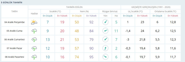 Kocaeli ise cumadan itibaren yağışlı havanın etkisi altına giriyor. Bugün parçalı bulutlu hava hakim olurken hava sıcaklığı en düşük 7, en yüksek 19 derece dolaylarında olacak. Cuma günü ise yağış geliyor en düşük 9, en yüksek 20 derece. Cumartesi en düşük 13, en yüksek 21 derece sağanak yağışlı. Pazar en düşük 12, en yüksek 19 sağanak yağışlı. Pazartesi en düşük 10, en yüksek 16 derece sağanak yağışlı olacak. Hava sıcaklıkları hafta başından itibaren mevsim normallerine inecek.