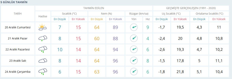 Kocaeli'nin 5 günlük hava tahmin raporu:
