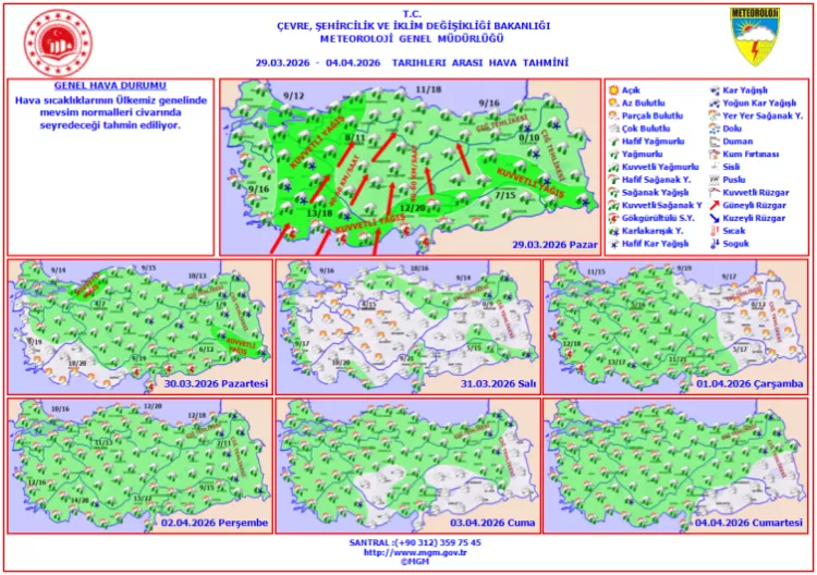 Haftanın ilerleyen günlerinde ise yağışlı hava yeniden etkili olacak. 1 Nisan Çarşamba günü yağmur beklenirken sıcaklığın 9 ile 15 derece arasında olacağı tahmin ediliyor. 2 Nisan Perşembe günü de yağışın devam etmesi beklenirken sıcaklıkların 8 ile 17 derece arasında seyredeceği ifade edildi.