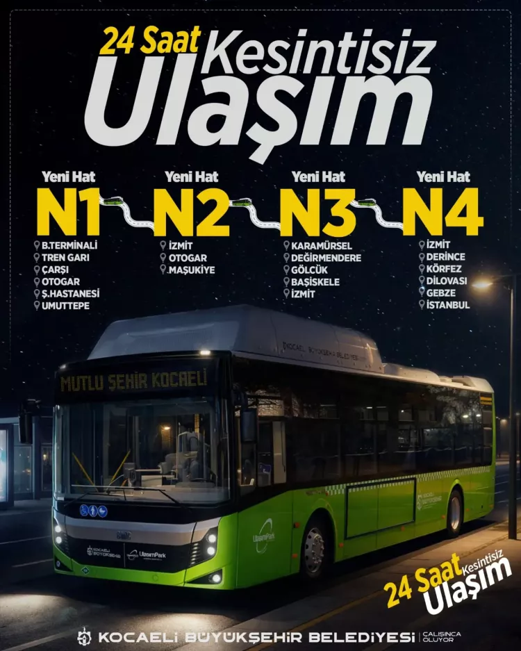 Kocaeli Büyükşehir Belediyesi ile gece ulaşımı güvenli, konforlu ve rahat bir şekilde sağlanmaya başlandı. Yeni hatlar sayesinde şehrin her köşesine her saatte ulaşım sağlanması hedeflenmektedir.