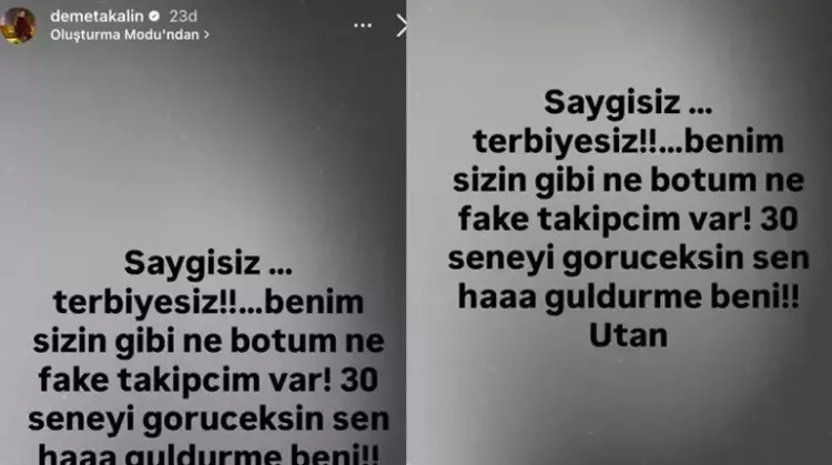 Blok3'ün sözlerine öfkelenen Demet Akalın; Instagram üzerinden Blok3'e "Saygısız ve terbiyesiz... Benim sizin gibi ne botum ne de sahte takipçim var. Otuz seneyi devireceksin, değil mi... Beni güldürme! Utan." şeklinde jet yanıt verdi.